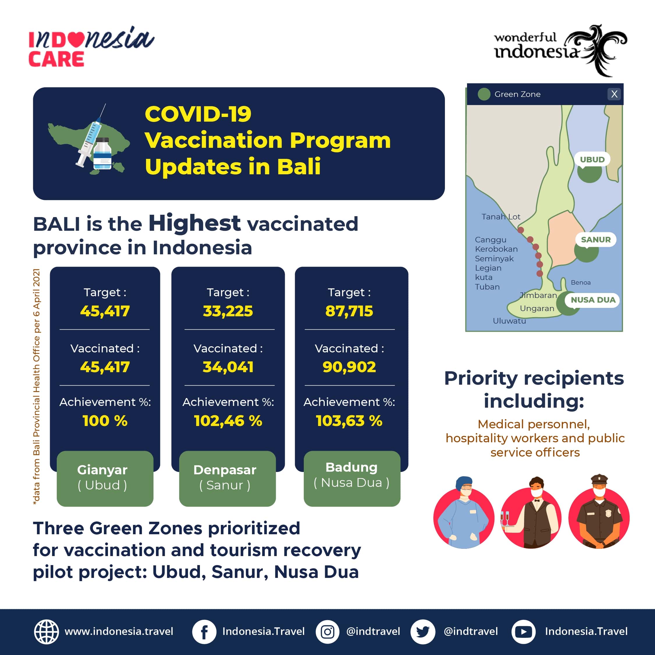 A key highlight is the COVID-19 vaccination program in Bali, which has been underway since 22 March 2021. The vaccination program prioritizes health and tourism business workers in three green zones assigned by the government: Ubud, Sanur, and Nusa Dua.
