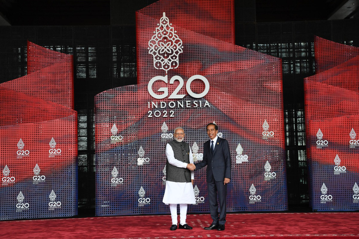 Source : President Joko Widodo (right) welcomes Prime Minister of India Narendra Damodardas Modi at the venue of the G20 Summit, in Nusa Dua, Bali, Tuesday, Nov. 15, 2022. G20 Indonesia Media Center/Sigid Kurniawan/nym/fi/22