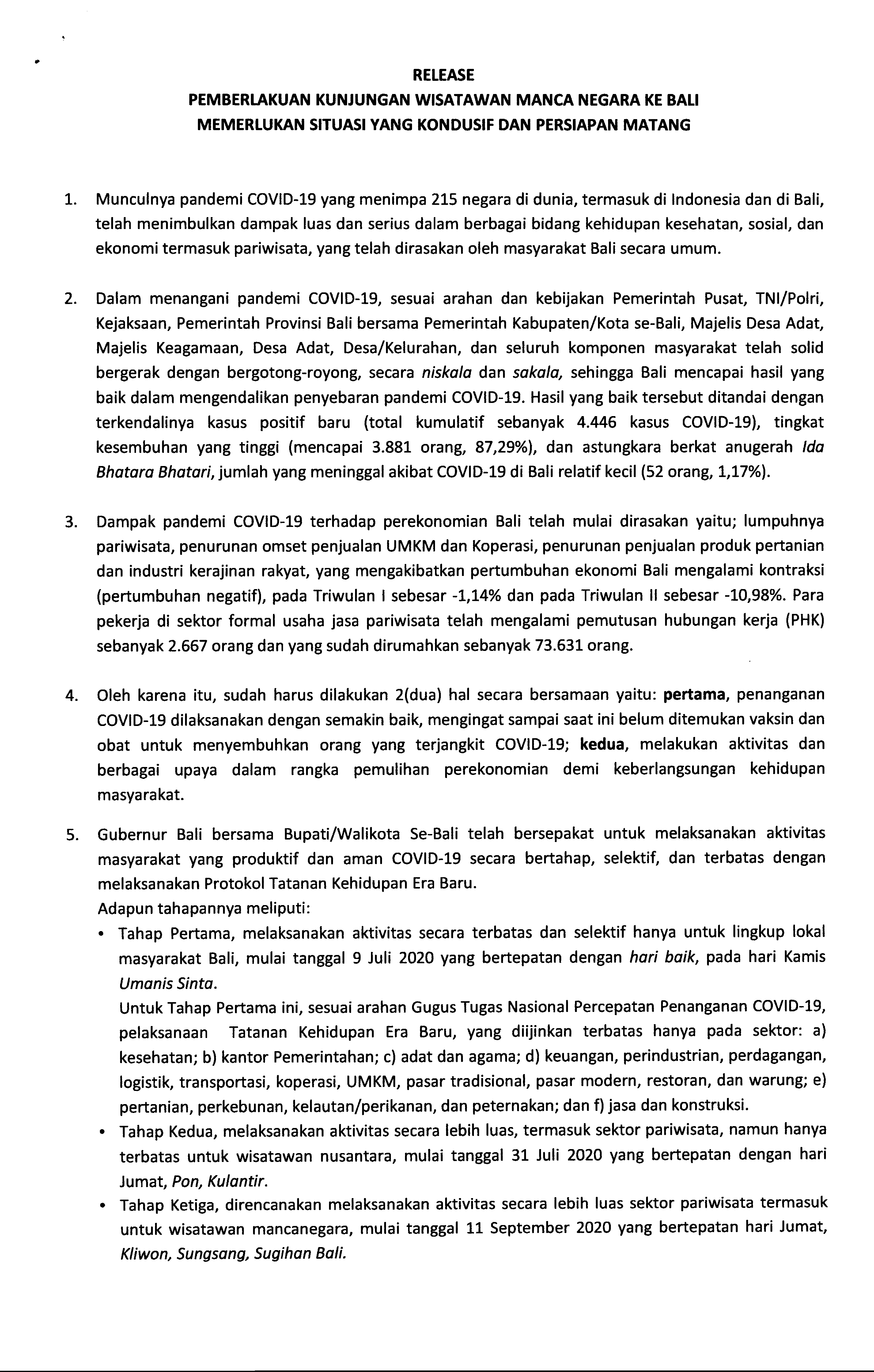 • Tahap pertama, melaksanakan kegiatan terbatas dan selektif hanya untuk masyarakat lokal di Bali, mulai tanggal 9 Juli 2020. Untuk Tahap Pertama ini, sesuai arahan Satgas Nasional Percepatan Penanganan COVID-19, pelaksanaan dari protokol Tatanan Kehidupan Era Baru terbatas pada: a) kesehatan; b) Kantor pemerintah; c) adat istiadat dan agama; d) keuangan, perindustrian, perdagangan, logistik, transportasi, koperasi, UMKM, pasar tradisional, pasar modern, restoran, dan warung; e) pertanian, perkebunan, kelautan / perikanan, dan peternakan; dan f) jasa dan konstruksi.