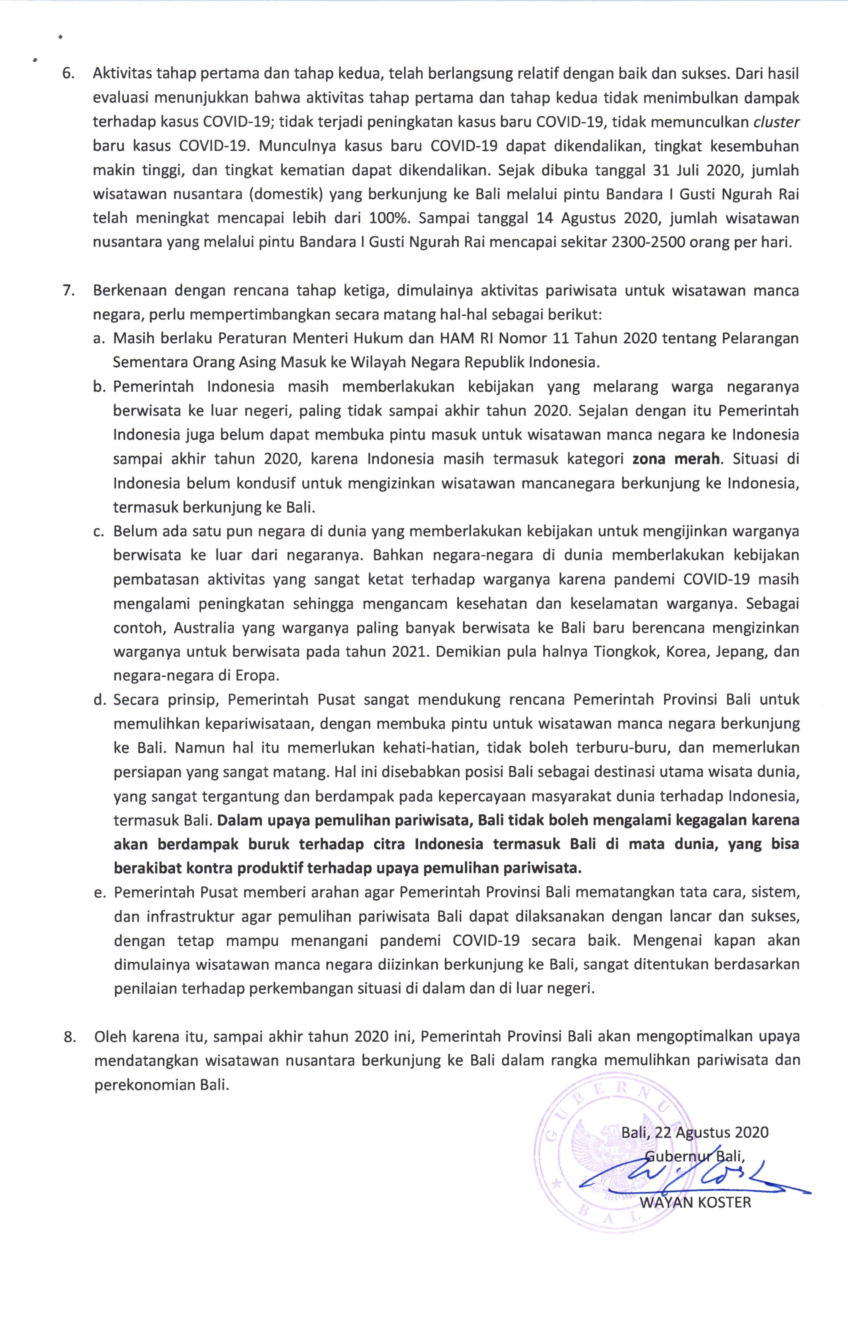• Tahap ketiga yang rencananya akan melaksanakan kegiatan lebih luas di bidang pariwisata termasuk bagi wisatawan mancanegara, akan dimulai pada 11 September 2020, dengan catatan bahwa tahap ini akan mengikuti perkembangan selanjutnya dari tahap pertama dan kedua.