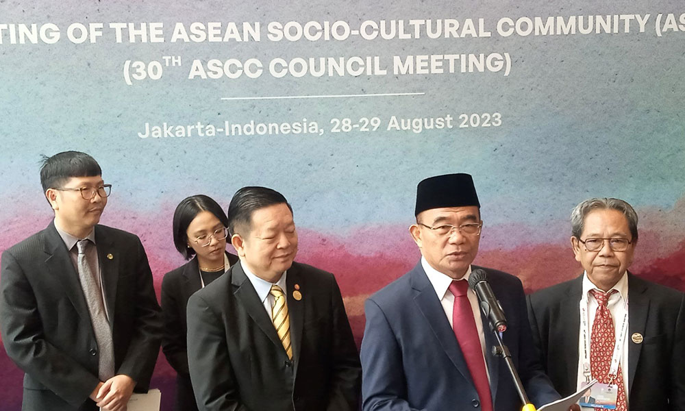 Menteri Koordinator bidang Pembangunan Manusia dan Kebudayaan RI, Muhadjir Effendy (Menko PMK), memberikan keterangan pers usai memimpin sidang Dewan Menteri Pilar Sosial Budaya ASEAN ke-30 (The 30th ASEAN Socio-Cultural Community/ASCC) 2023 di Jakarta.