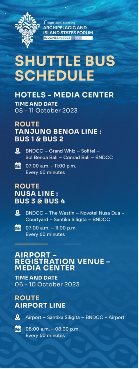 Jakarta, 6 Oktober 2023 – Panitia penyelenggara Konferensi Tingkat Tinggi (KTT) Archipelago and Island States (AIS) Forum telah menyiapkan shuttle bus gratis bagi para jurnalis menuju Media Center di Bali Nusa Dua Convention Center (BNDCC) di Nusa Dua, Kabupaten Badung, Bali. Experience Indonesia in 360